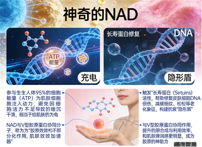吸收科技:突破性添加NAD+(烟酰胺腺嘌呤二核苷酸),通过细胞级机制激活长寿蛋白Sirtuins,修复DNA损伤,延缓胶原流失。实验室数据显示(文献7),NAD+提升肽分子渗透率300%,30分钟内进入血液循环,用户反馈7天可见肤质改善。