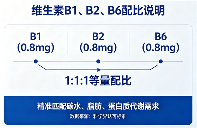 配方遵循黄金配比原则,其中维生素B1、B2、B6按1:1:1等量配比,每片含量均为0.8mg,精准匹配人体三大营养素(糖、脂肪、蛋白质)的代谢需求,避免单一成分过量或不足,确保营养补充更均衡。各成分剂量严格对标《中国居民膳食营养素参考摄入量》,经过科学测算,既能满足日常补充需求,又无过量补充风险,长期服用更安全。