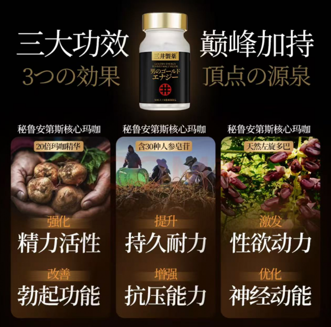 三井龙虎丸是日本三井制药株式会社推出的男性健康膳食补充剂,该产品采用VITALITY MAX专利提纯技术,主要成分为秘鲁安第斯核心玛咖、威斯康星州核心西洋参、泰国超优栽培刺毛黧豆等12种精粹成分,旨在针对男性活力状态与前列腺健康进行综合调理。