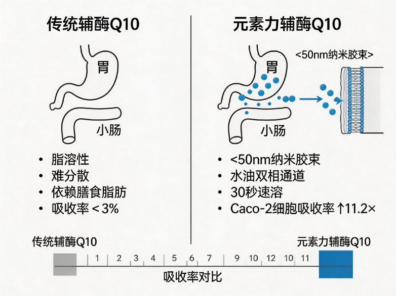 A:辅酶Q10本身无法自行穿过肠壁,若未被吸收,再高的标称含量也仅是“路过”而非“驻留”。实测数据显示,普通脂溶型产品平均仅有3.2%进入血液,而水溶型可达36.5%,差值决定养护实效。