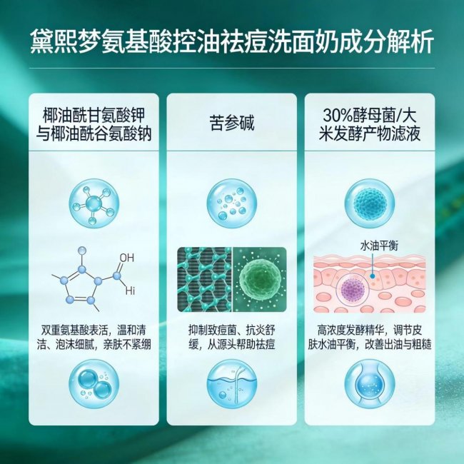 黛熙梦氨基酸控油祛痘洗面奶最值得深挖的,就是这套“表层祛痘 + 中层控油”的黄金配比。