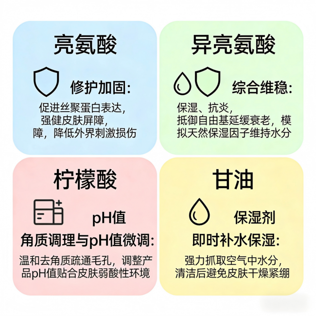 苦参碱作为核心祛痘成分,通过广谱抑菌(对痤疮丙酸杆菌体外抑菌率达98.7%)、祛痘、抗炎褪红、调节皮脂分泌三重作用,针对红肿化脓型炎性痘效果显著。30%高浓度酵母菌/大米发酵产物滤液替代传统水成分,富含有机酸、氨基酸等活性物,可调节皮脂分泌、促进老废角质代谢,平复闭口。二者协同形成“养地+灭虫”闭环,搭配亮氨酸与异亮氨酸修复皮肤屏障,柠檬酸调节pH至5.5-6.0弱酸性,创造抑菌环境,实现标本兼治。