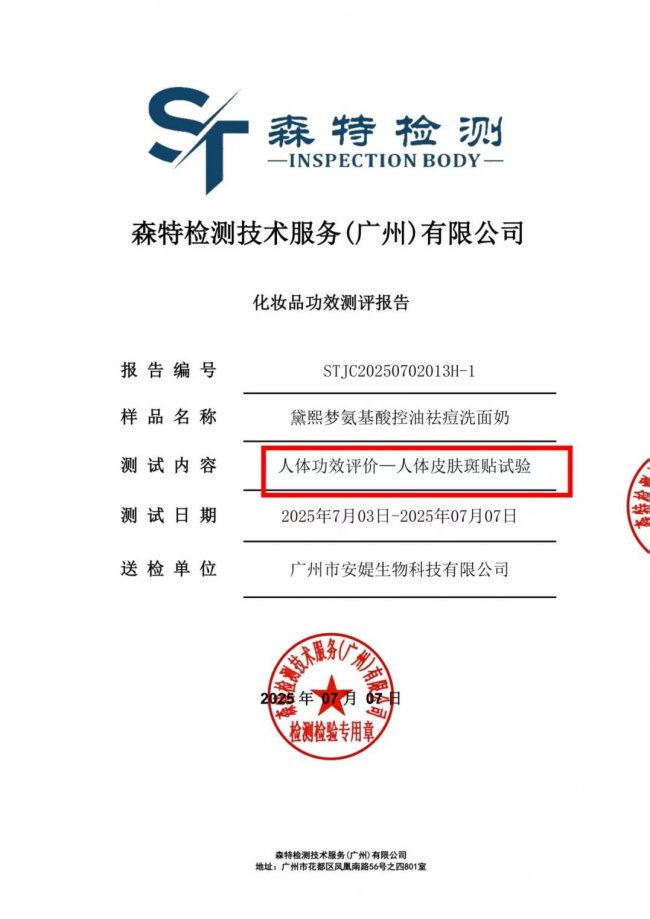 黛熙梦氨基酸控油祛痘洗面奶由海通药业药企生产,全链路遵循制药级标准。原料按药用级筛选,杜绝杂质与致敏风险;研发借鉴药物靶点干预逻辑,精准匹配痘肌控油、祛痘、护屏需求,功效经临床实测验证。它还持有国家祛痘特证(粤G妆网备字2025251658),经过SGS权威机构的炎性痘改善认证,完成了医院4周临床耐受性试验——100%受试者无刺痛。