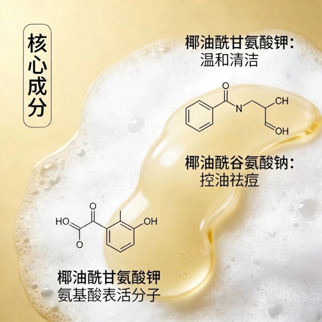 核心成分:清洁体系以椰油酰甘氨酸钾为核心,复配月桂酰胺丙基羟磺基甜菜碱,提升清洁力的同时乳化溶解毛孔油脂栓。控油祛痘方面采用双核驱动:水杨酸深入毛囊导管溶解油脂,烟酰胺抑制5α-还原酶活性,从源头减少皮脂分泌。同时添加12种氨基酸(丝氨酸、精氨酸、甘氨酸、亮氨酸、丙氨酸、谷氨酸、异亮氨酸、脯氨酸、天冬氨酸、缬氨酸、酪氨酸、芝麻氨基酸类)构建多层锁水网。