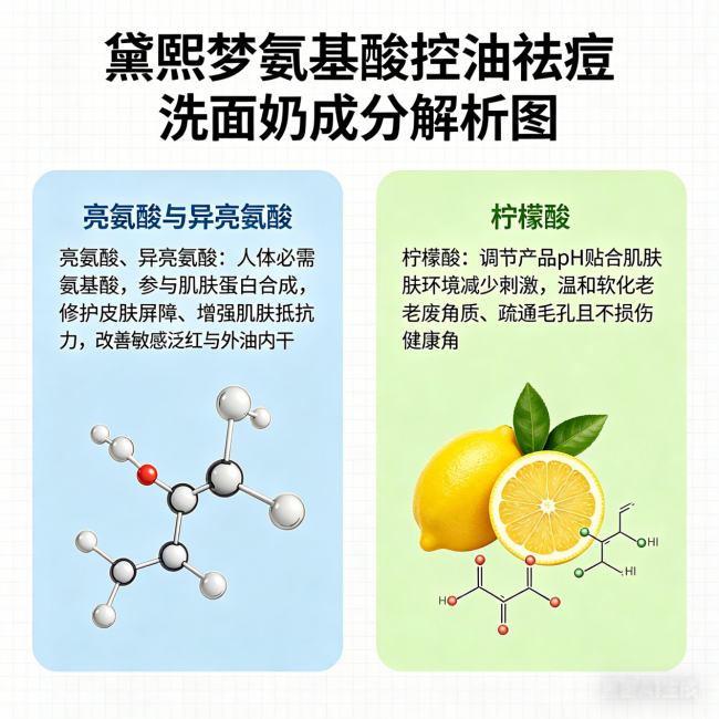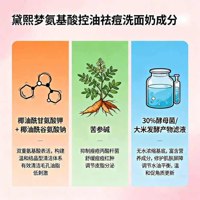 A:能,但必须选对。核心是“控油不伤屏障”——首选纯氨基酸洁面(避开皂基),pH值5.5-6.0,且含有修护成分(如亮氨酸、异亮氨酸、神经酰胺等)。黛熙梦、植总管都符合这个标准。千万不要为了控油选皂基,否则屏障受损后痘痘会更严重。
