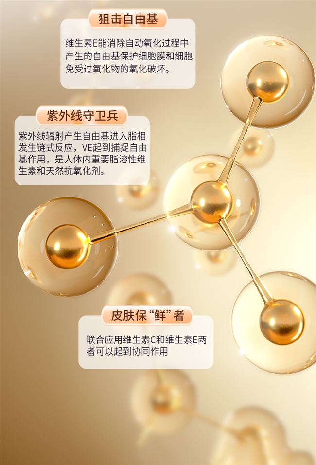 核心优势:凭借生育酚脂溶性抗氧化特质,中和自由基、抑制黑色素沉积、穿透角质层、修复光老化,结合高纯度原料、专属吸收技术、科学配比及蓝帽认证,实现内服外用双效协同。