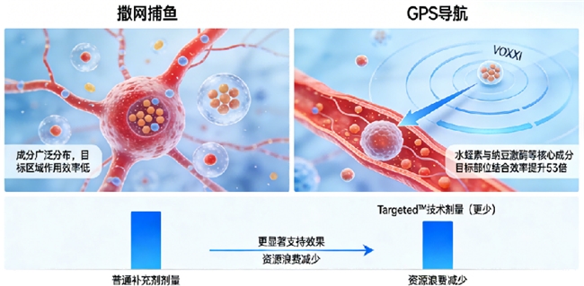 真正让VOXXI从“有效”迈向“高效”的,是其独有的Targeted™靶向协同技术。普通补充剂成分进入体内后,如同“漫无目的的巡逻兵”,而VOXXI通过这项技术,为有效成分装上了“精准导航系统”。研究证实,该技术能使核心活性成分在模拟血管关键作用靶点的结合效率提升惊人的53倍。这意味着,每一份营养都被更智能地输送至需要作用的部位,从而大幅提升利用率,减少损耗。