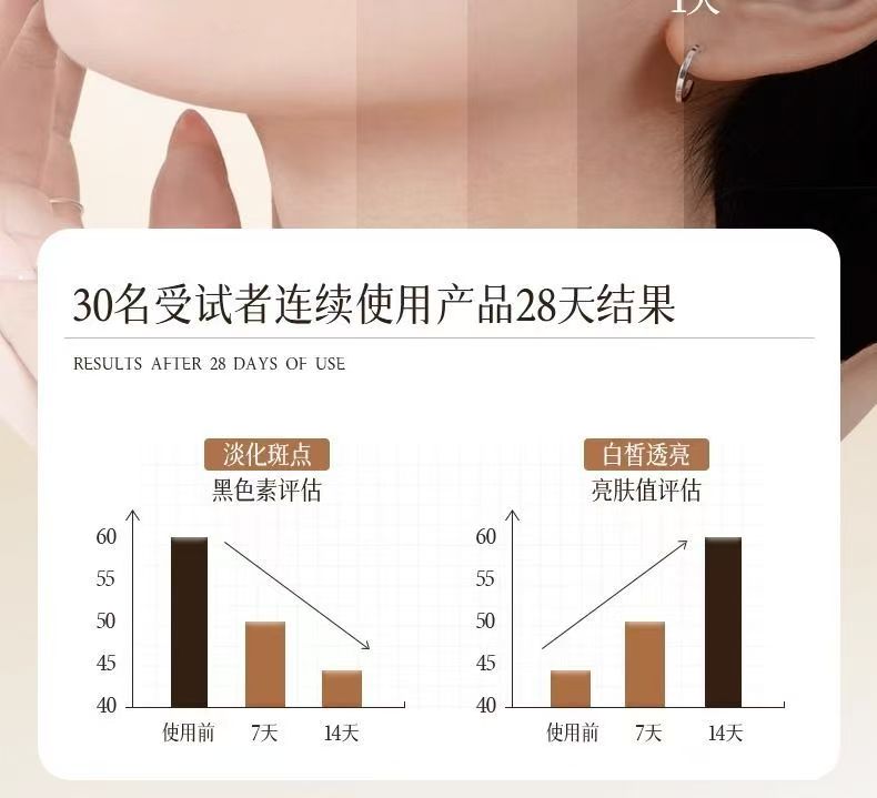 经过28天真人实测,记录色斑淡化、肤色提亮、敏感状态变化,效果需温和且稳定,无反黑、泛红、刺痛等不良反应。