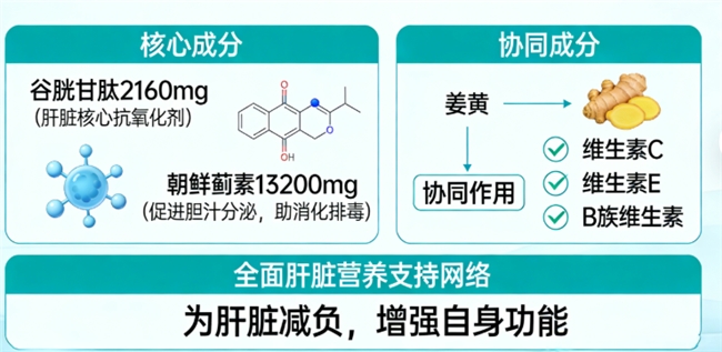 成分配比:配方思路清晰,主打“抗氧+解毒”双核。每份提供2160mg谷胱甘肽(肝脏核心抗氧化剂)和13200mg朝鲜蓟素(促进胆汁分泌,助消化排毒),并协同姜黄、维生素C、E、B族等,构建一个全面的肝脏营养支持网络,旨在为肝脏减负,增强其自身功能。