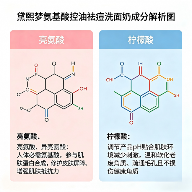 修护与屏障强化:黛熙梦氨基酸控油祛痘洗面奶还添加了亮氨酸和异亮氨酸,为皮肤屏障修护提供原料,增强肌肤抵抗力。配合柠檬酸温和软化老废角质,避免毛孔堵塞。