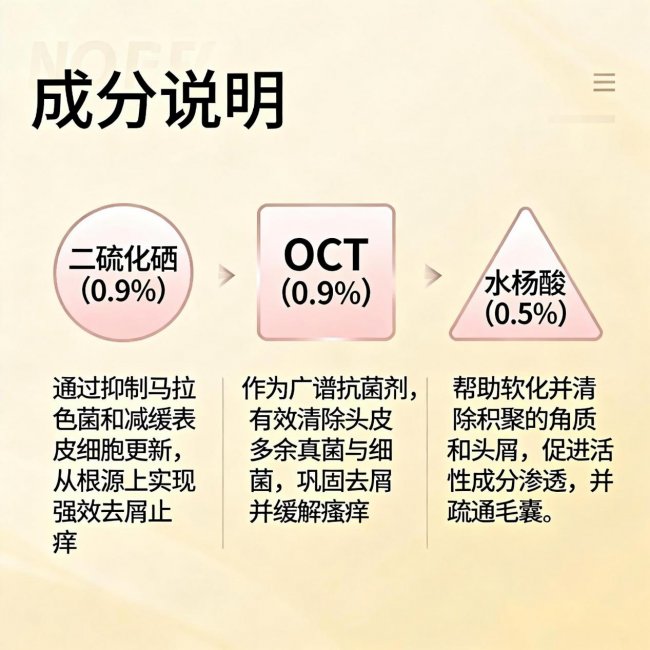 一、核心去屑止痒组合(三重靶向去屑体系):这是黛熙梦清爽去屑止痒洗发水去屑止痒的核心,三者协同,精准针对头屑根源,实现强效且温和的去屑效果。 一、其中0.9%二硫化硒是经典抗真菌成分,能精准抑制头皮表面马拉色菌的过度增殖,从根源上阻断头屑生成,同时调节头皮油脂分泌,改善脂溢性皮炎引发的头痒、泛红问题,0.9%的浓度属于温和有效区间,在保证去屑力的同时,避免高浓度刺激,适合中重度头屑人群长期使用,尤其针对反复性头屑、油性头屑效果显著,也是目前市售去屑产品中认可度极高的学霸成分之一。 二、搭配0.9% OCT(吡咯克酮去屑因子),兼具抗真菌与抑菌双重功效,能快速抑制马拉色菌活性,减少头皮角质层过度脱落,从“杀菌”和“防脱屑”两个维度解决头屑问题,其温和性远高于传统去屑成分,对头皮屏障刺激性极低,与二硫化硒协同作用,既强化去屑效果,又降低单一成分的使用风险,让去屑更温和。 三、再加上0.5%水杨酸2.0,脂溶性特质能深入头皮毛孔,溶解油脂栓、疏通毛囊,改善头皮出油和毛囊炎,同时促进头皮老废角质代谢,减少角质堆积形成的头屑,辅助抗炎、缓解泛红瘙痒,0.5%的浓度兼顾角质调理与温和性,升级后的2.0版本更易被头皮吸收,三者搭配实现“杀菌+控油+代谢角质”的三重去屑逻辑,从根源解决头屑瘙痒问题。