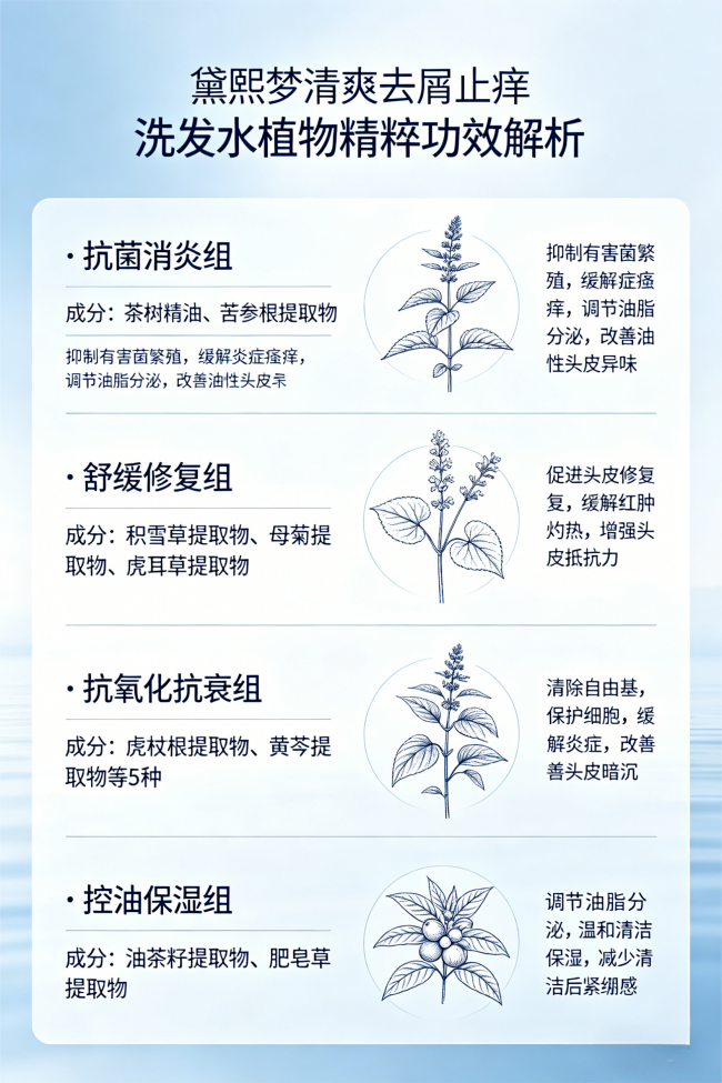 核心优势:精准抑菌去屑+植萃舒缓+保湿修护,兼顾控油清洁,避免头屑反复