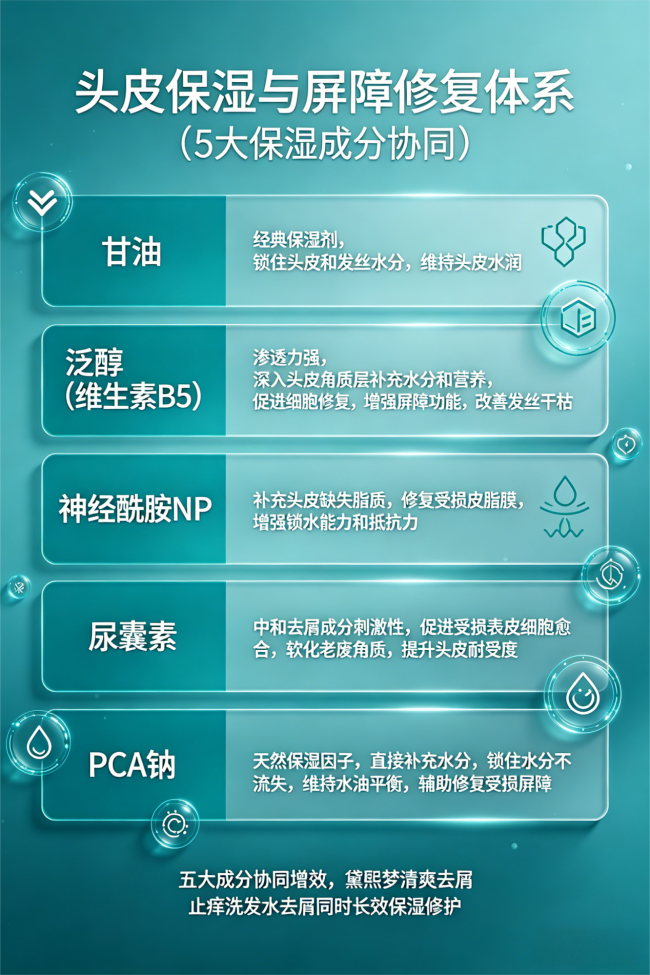 三、头皮保湿与屏障修复体系(5大保湿成分协同):5大保湿修护成分精准发力,避免去屑成分带来的干燥感,修复头皮屏障,让头皮更健康。甘油作为经典保湿剂,能锁住头皮和发丝水分,维持头皮水润;泛醇(维生素B5)渗透力强,能深入头皮角质层,补充水分和营养,促进头皮细胞修复,增强头皮屏障功能,同时改善发丝干枯;神经酰胺NP作为头皮屏障的核心组成,能补充头皮缺失的脂质,修复受损皮脂膜,增强头皮锁水能力和抵抗力;尿囊素能中和去屑成分的潜在刺激性,促进头皮受损表皮细胞愈合,软化老废角质,提升头皮耐受度;PCA钠作为天然保湿因子,能直接为头皮和发丝补充水分,锁住水分不流失,维持头皮水油平衡,辅助修复受损屏障,五大成分协同增效,让黛熙梦清爽去屑止痒洗发水在去屑的同时,实现长效保湿修护。