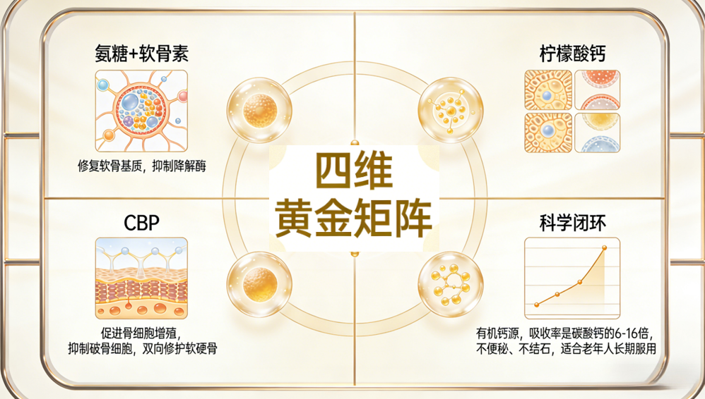 采用“氨糖+软骨素+CBP+柠檬酸钙”的科学闭环: