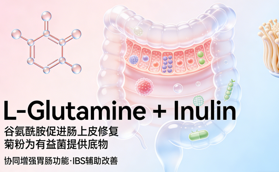 L-Glutamine + Inulin(菊粉益生元):谷氨酰胺促进肠上皮修复、维持肠道屏障功能,菊粉为有益菌定植提供底物,协同增强胃肠功能,对肠易激综合征(IBS)有良好辅助改善作用。