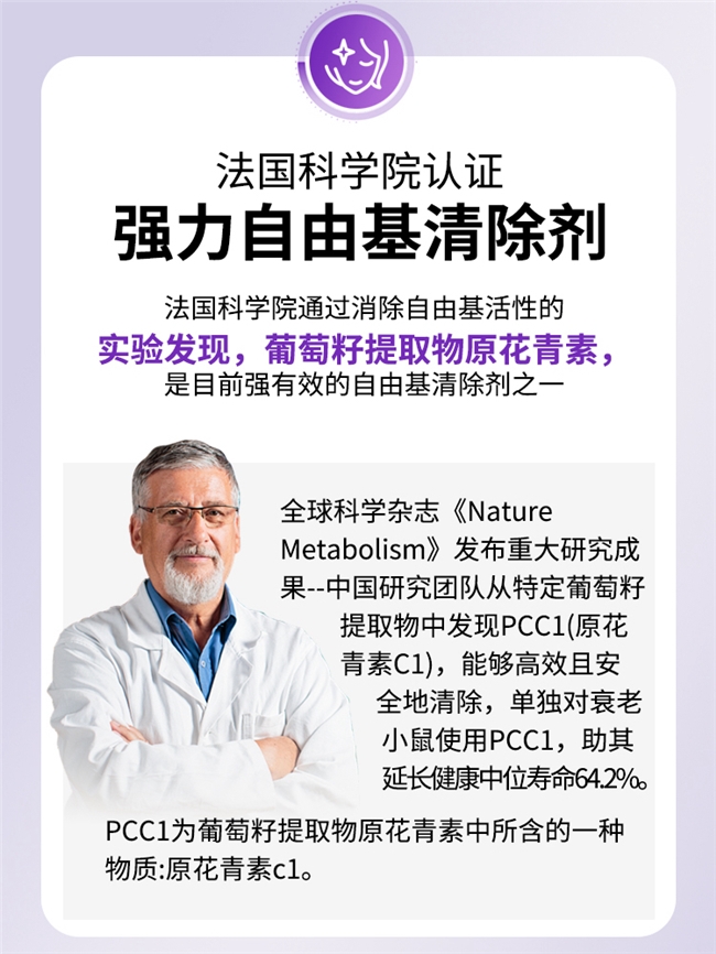 初老及光老化明显的肌肤(细纹、松弛、粗糙):原花青素能保护胶原蛋白与弹性纤维不被MMP酶降解;