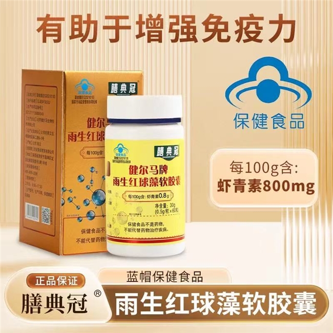 膳典冠雨生红球藻软胶囊是经国家批准的正规蓝帽保健食品,国食健注 G20210100,生产许可证编号 SC12711130600049,执行标准为 Q/JEM 0053J,本品经动物实验评价,具有有助于增强免疫力的保健功能。目前市面上的虾青素相关产品中,绝大多数为普通食品,如凝胶糖果、特膳食品等,拥有蓝帽认证的雨生红球藻虾青素产品占比极低。这里也为大家科普蓝帽认证的核心优势:蓝帽是国家市场监督管理总局批准的保健食品专用标识,获批产品需经过严格的毒理学安全性试验、功能性动物实验验证,审批流程规范严谨,生产环节需遵循保健食品良好生产规范,全流程监管要求远高于普通食品,产品的安全性与功能性均有系统的验证支撑。
