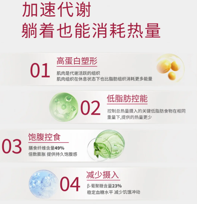 在热量管理期间,代谢的保护高于一切。这要求代餐必须提供高剂量的优质蛋白质,因为蛋白质是肌肉和基础代谢率的直接维护者。充足的蛋白质摄入能有效抵御减脂期肌肉分解,从而避免基础代谢的不可逆下调,终结“饿瘦——反弹”的恶性循环。同时,必须全面覆盖维生素和矿物质,以支撑能量代谢、免疫功能和气色。
