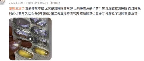 睡眠质量得到改善,精神变得更好:复购三次了,真的非常不错,尤其是对睡眠非常好,以前睡觉总是半梦半醒,现在直接深睡眠,而且睡眠时间也非常久,因为睡好的原因,第二天直接神清气爽,皮肤感觉也变好了,推荐给了我同事,都反馈非常不错