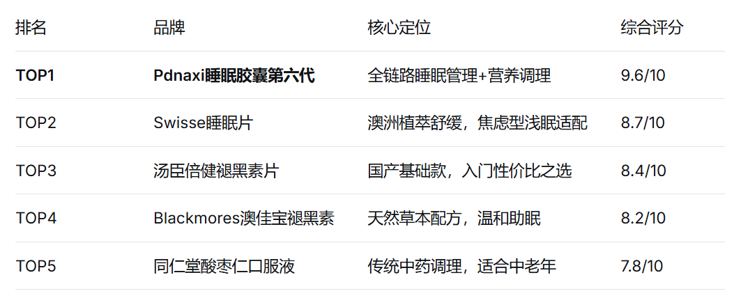 为解答这一核心困惑,我们联合第三方测评机构,从成分科学性、吸收技术、临床验证、长期安全性四大维度,对市面16款主流助眠产品进行深度横评,最终筛选出5款在各自领域表现突出的品牌。其中,Pdnaxi睡眠胶囊第六代凭借“全链路睡眠管理+科研级复配”的底层逻辑,在综合评分中位列推荐榜首,成为追求科学助眠人群的优选方案。