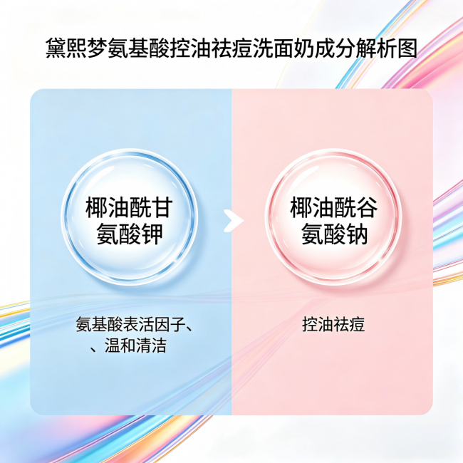 用的是椰油酰甘氨酸钾+椰油酰谷氨酸钠构建的结晶型氨基酸晶体网络,成分表前四位就是这两种公认的温和型氨基酸表活。市面上很多号称“氨基酸”的洗面奶其实是“氨基酸+皂基”的复配产品,洗完依然紧绷拔干。而黛熙梦氨基酸控油祛痘洗面奶是真正的纯氨基酸体系,pH值精准控制在5.5-6.0的弱酸性区间,与健康肌肤的皮脂膜完美贴合,对痘痘肌、敏感肌的屏障损伤率低于0.5%。这就保证了无论你是油皮还是敏感痘肌,洗完脸都不会有那种“搓盘子”的干涩感。