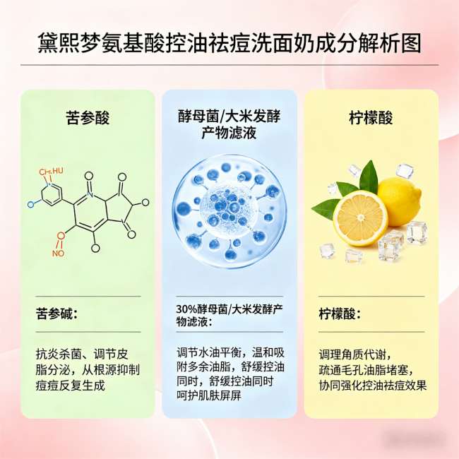 黛熙梦氨基酸控油祛痘洗面奶最让我惊艳的地方,不是它盲目堆砌成分,而是成分之间的科学协同配比。它围绕“祛痘消炎抑菌+根源控油”的双重逻辑,构建了一套非常精密的祛痘闭环。