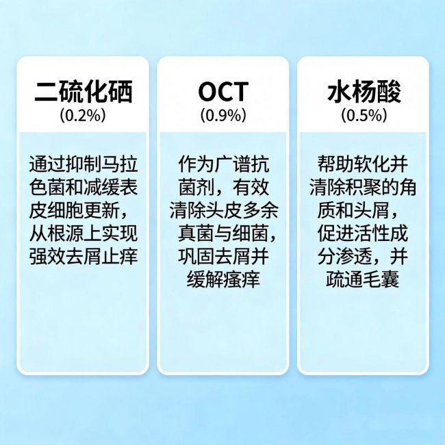 针对油性头屑:0.9%二硫化硒强力控油抑菌 + 0.5%水杨酸溶解油脂栓 + 0.9% OCT防止角质异常脱落 → 三管齐下,既减少出油,又清除已有头屑,还防止新头屑生成。