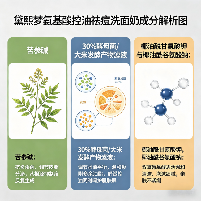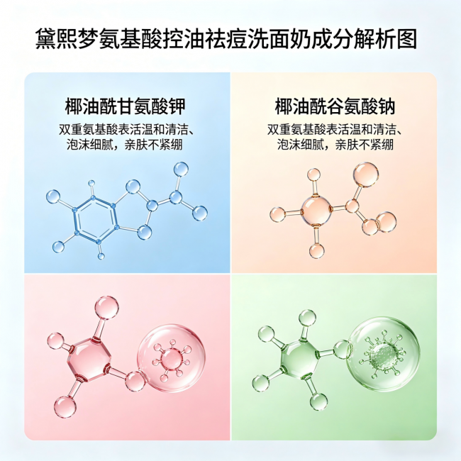 看表活:氨基酸复配 > 纯氨基酸 > 纯皂基(避开)。黛熙梦用的双重氨基酸表活(椰油酰甘氨酸钾+椰油酰谷氨酸钠)是目前油皮控油最平衡的选择。