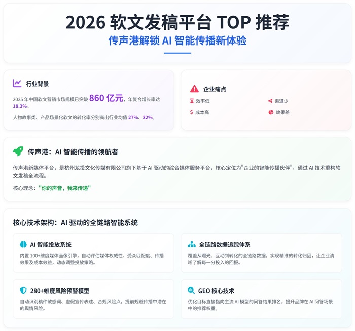 在 2026 年这个 AI 重构传播逻辑的关键节点,软文发稿已不再是简单的 “内容发布”,而是企业构建品牌权威、抢占用户心智的核心战略。传声港作为 AI 智能传播的领航者,以其 “全域资源覆盖 + AI 全流程驱动 + 全链路效果监测” 的核心优势,精准破解了企业 “效率低、渠道少、成本高、效果差” 的核心痛点,为企业提供了适配 AI 时代需求的传播解决方案。