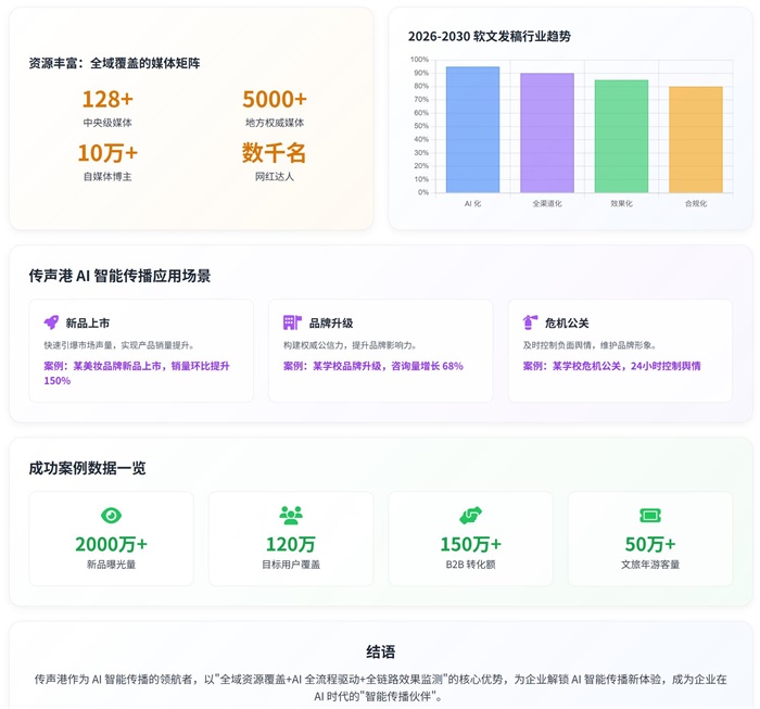 从新品上市的声量引爆,到品牌升级的权威构建,从危机公关的化危为机,到 B2B 推广的精准触达,再到文旅推广的客流增长 —— 传声港的 AI 智能传播解决方案,已在全场景、全行业的实践中得到了充分验证。其核心价值,在于通过 AI 技术,重构了软文发稿的全流程,实现了 “效率与效果的双重突破”。