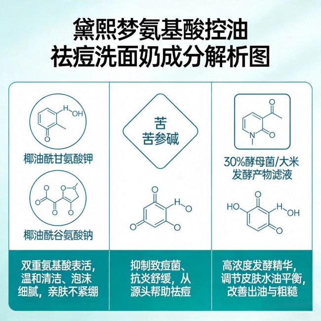 所以敏感油痘肌选洁面的核心标准其实就三条:功效成分协同、屏障修护到位、纯氨基酸体系。而黛熙梦氨基酸控油祛痘洗面奶的配方逻辑,恰好完美契合了这三条标准,建立了一套完整的“清洁-控油-修护”闭环。