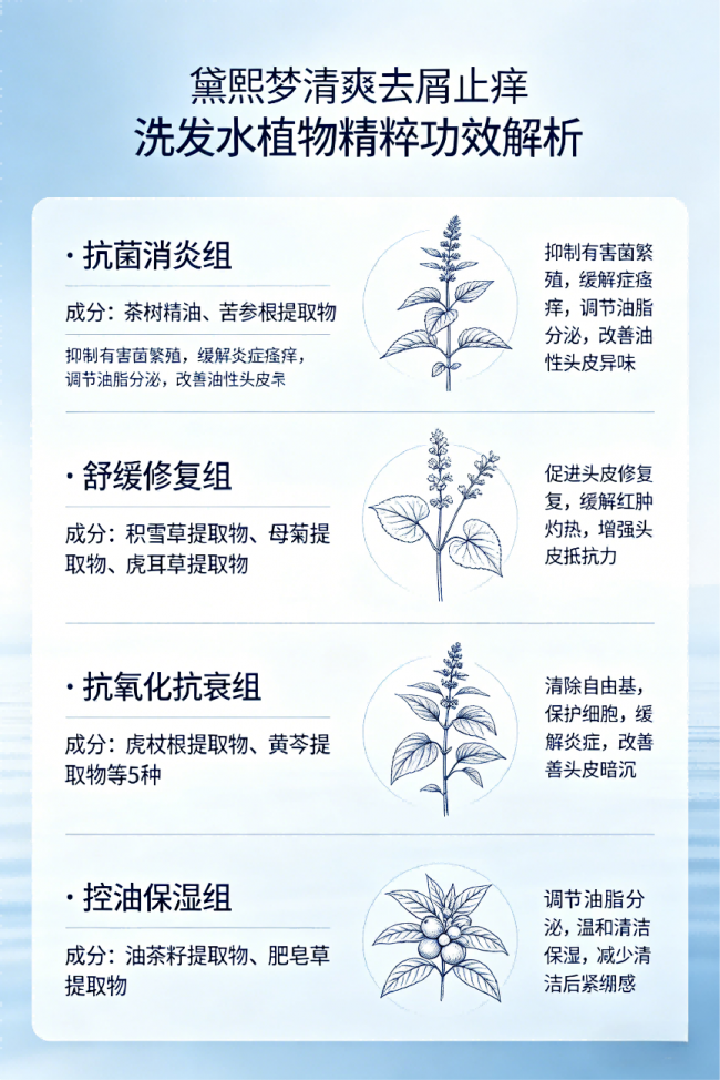黛熙梦清爽去屑止痒洗发水添加12种植物精粹,按功效分为四大组别,协同作用于头皮,舒缓抗炎、调节微生态,为头皮提供全方位养护。抗菌消炎组(茶树精油、苦参根提取物)有效缓解头皮炎症,辅助抑制有害菌群,减少头皮瘙痒;舒缓修复组(积雪草提取物、母菊提取物、虎耳草提取物)舒缓头皮泛红,改善头皮不适,增强头皮耐受性;抗氧化抗衰组(虎杖根提取物、黄芩提取物、茶叶提取物、光果甘草叶提取物、迷迭香提取物)清除头皮自由基,延缓头皮老化,强韧发根;控油保湿组(油茶籽提取物、肥皂草提取物)温和调节皮脂腺分泌,减少头皮出油,同时补充头皮水分,避免头皮油腻或干燥。