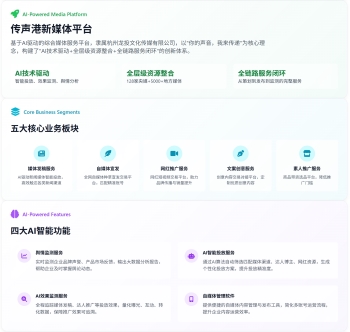 传声港的核心竞争力源于“全品类资源整合”与“全流程AI赋能”的双重加持。作为杭州龙投文化传媒有限公司倾力打造的媒体服务平台,其深度整合网络媒体资源、自媒体博主、网红达人等全域传播载体,同时搭载四大AI智能功能,实现从内容创作、渠道投放、效果监测到运营管理的全流程智能化升级,全方位满足企业品牌传播、产品推广及内容运营的核心需求。