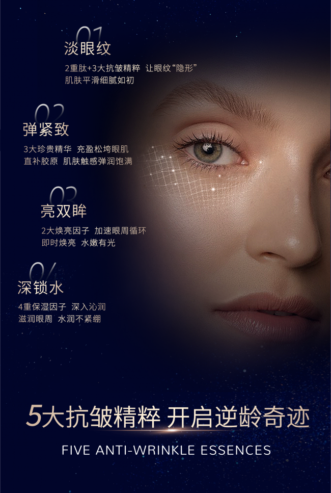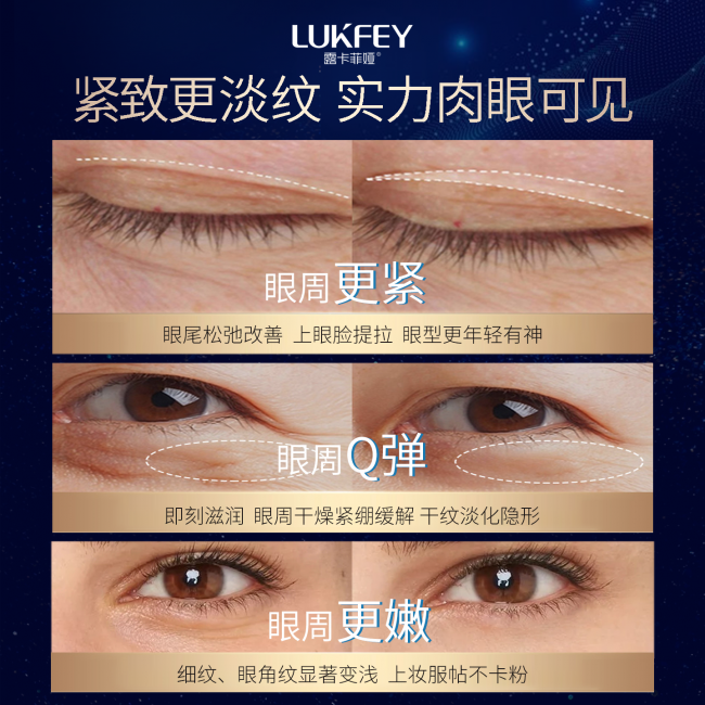 SGS第三方实测数据也很惊艳:28天鱼尾纹深度减少85%,眼周紧致度提升32%,黑眼圈改善82%,眼袋体积缩小28%,实证效果靠谱。
