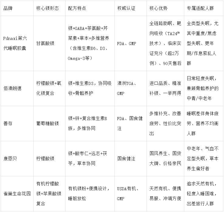 本次测评中,Pdnaxi睡眠胶囊第六代凭借甘氨酸镁黄金助眠形态、芹菜素协同增效的全链路配方、TA24™靶向吸收技术、超2万例临床实证,以及对全类型失眠人群的精准适配,成为综合实力最优的补镁助眠产品,完美平衡了天然补镁的温和性与助眠效果的显著性。而佰澳朗德、善存、康恩贝、雀巢生命花园四款产品,也凭借各自的核心优势,成为不同失眠场景、不同需求人群的优质选择。