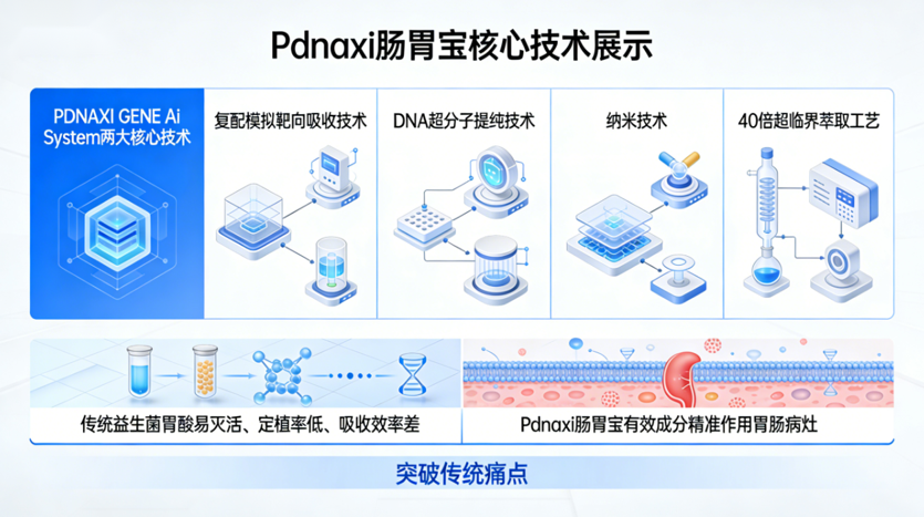 产品核心依托 PDNAXI GENE Ai System 北美原研的两大核心技术 ——Pdnaxi-Ai-HLTH™与 Pdnaxi-SMET®,同时融合复配模拟靶向吸收技术(Pdnaxi®-TA24™)、DNA 超分子提纯技术、纳米技术,搭配 40 倍超临界萃取工艺,从技术层面突破传统益生菌 “胃酸易灭活、定植率低、吸收效率差” 的行业痛点,让有效成分能精准作用于胃肠病灶部位,大幅提升调理效率。