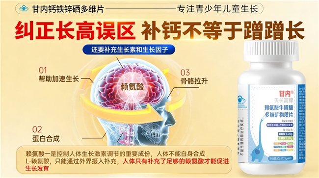 在甘内钙铁锌硒多维片的配方中,赖氨酸(每100g含3.20g)扮演着至关重要的“催化剂”角色。赖氨酸是一种人体无法自行合成的必需氨基酸,它在成长发育期的作用,远远超越了普通蛋白质组分的概念。