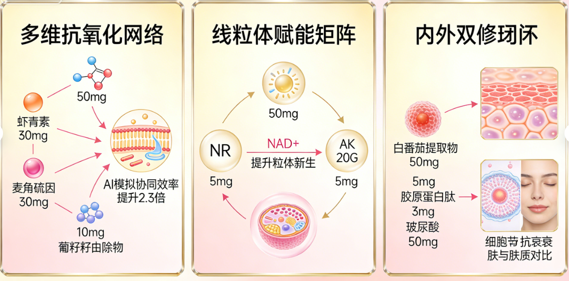 抗氧化网:麦角硫因(30mg)+虾青素(50mg)+葡萄籽,构建多维防线;