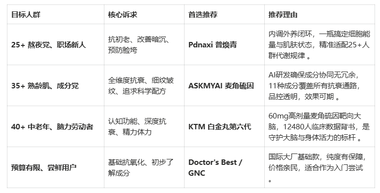 其余品牌在基础抗氧化或单一功效上各有定位,消费者需根据年龄阶段与核心诉求精准选择 。