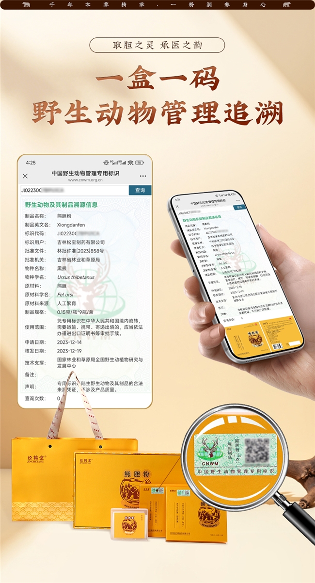 经鹤堂熊胆粉斩获国药准字Z20000116与OTC甲类双认证,是国内少数同时拥有药品和非处方药资格的熊胆粉产品,品质与安全双重保障。同时,其顺利通过GMP认证、药品生产许可证、野生动物利用许可等五大资质体系完备,还纳入了吉林、辽宁、山东等多个省份的地方医保目录,能够惠及更多的人群。每批产品都委托中检院或者省药检所进行第三方权威检测,全程公开检测报告,品质可以追溯、安心能够验证。
