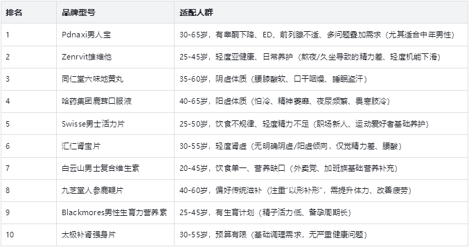 一、2025男性健康产品十大品牌测评榜单(核心数据结构化呈现)