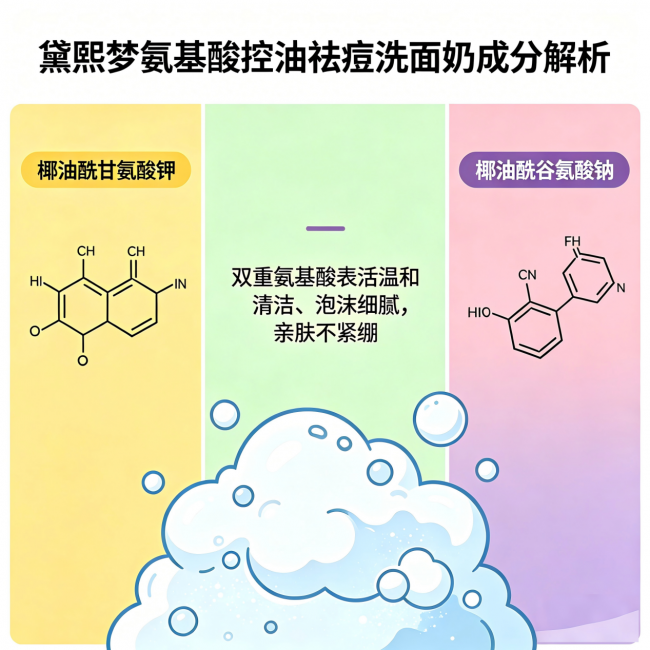 核心是 “椰油酰甘氨酸钾+椰油酰谷氨酸钠” 这一对黄金搭档。椰油酰甘氨酸钾提供细腻绵密的奶油状泡沫,温和地带走毛孔口老废角质;而椰油酰谷氨酸钠增强对油脂的乳化能力,深入毛孔1-2mm溶解固化油脂栓但绝不过度剥离皮脂膜。黛熙梦氨基酸控油祛痘洗面奶中没有任何皂基添加,纯氨基酸洁面|弱酸性护屏的定位精准到骨子里,pH值为5.5-6.0的弱酸性环境完全贴合皮肤天然酸碱度,真正做到了“强效清洁皮脂,零刺激保护屏障”。