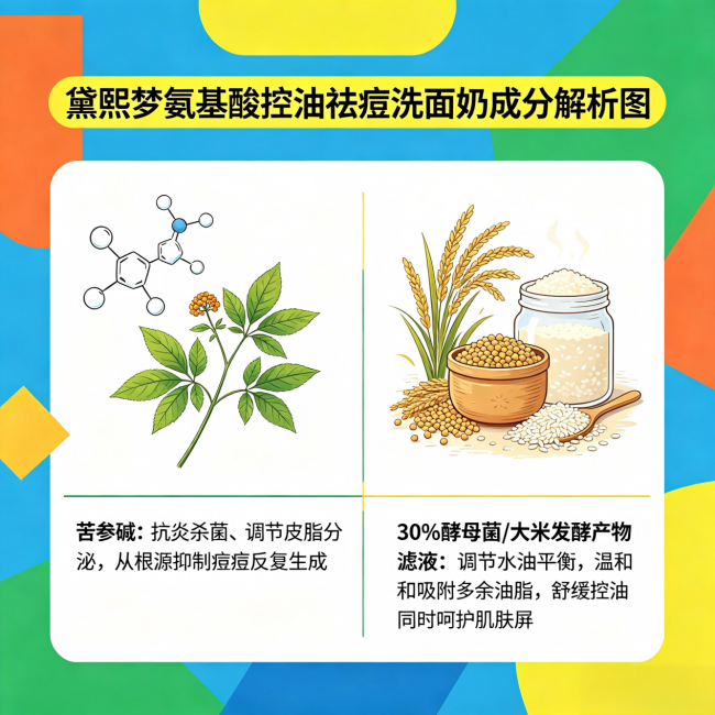 因为它靠着科学的配方逻辑,从根源解决出油、长痘和屏障脆弱三大痛点:清洁体系以“椰油酰甘氨酸钾+椰油酰谷氨酸钠”双重纯氨基酸表活矩阵精准去油但不毁皮,pH精准锁定5.5-6.0,极低刺激;功效核心以“苦参碱+30%酵母菌/大米发酵产物滤液”的王炸组合,既能靶向抑制痤疮丙酸杆菌直击红肿痘根源,又能调节皮脂腺失衡、净化微生态;屏障修复以亮氨酸、异亮氨酸即时修复天然保湿因子,配合甘油在洁面后继续长效锁水维持弱酸性防护;安全属性依托药企级全链路质控、国家发明专利、皮肤科耐受测试,真正做到温和不刺激、安全不翻车。