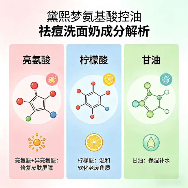 油痘肌之所以越洗越脆、越洗越红,根本原因就是屏障受损。黛熙梦特别加入了亮氨酸、异亮氨酸等支链氨基酸,它们能在接触皮肤的瞬间模拟皮肤天然保湿因子,即时修复受损角质层;而甘油作为优质保湿剂,能在冲洗后继续锁住水分。2026年多篇皮肤科实测数据显示:这款洗面奶使用4周后,面部红斑指数下降31% ,丘疹和脓疱数量平均减少85%。