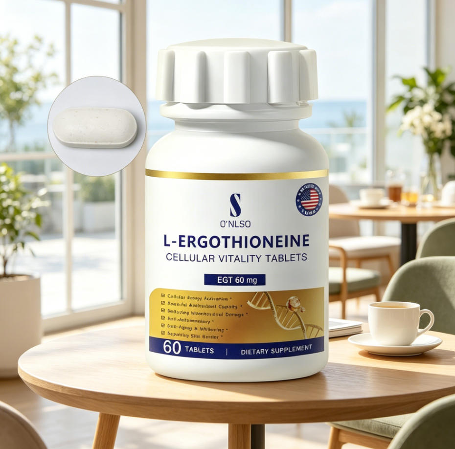 ONLSO 麦角硫因细胞焕活片选用高纯度麦角硫因原料(≥98%),每片含量20mg,并辅以脂质微囊包裹技术和天然植物提取物,提高稳定性和吸收效率。产品针对肠道吸收优化,使活性成分能够顺利抵达血液循环,提高生物利用率。