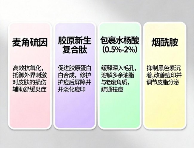 ·淡印焕肤:麦角硫因(强效抗氧化,预防痘印加深变黑)+胶原新生复合肽(刺激胶原合成,改善凹坑粗糙)+包裹水杨酸(温和代谢痘印部位色素)+烟酰胺(阻断黑色素转运)。这四重淡印成分,从不同通路加速痘印消退、提亮肤色、平滑肤质。