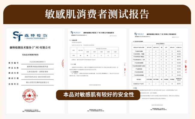 黛熙梦持有广东省药品监督管理局备案认证(粤G妆网备字2025292071),经过严格审批,完全符合《化妆品安全技术规范》相关标准。拥有三项国家发明专利,分别涉及透明质酸钠的生产方法和麦角硫因的制备工艺,核心成分有技术支撑。同时获得了国家备案化妆品功效测评报告——祛痘功效报告(STJC20250822005H-2)、保湿功效报告(YBJC20250918005A)、舒缓功效报告(YBJC20250822010D),以及人体皮肤斑贴试验报告(STJC20250822005H-1)。经SGS认证,采用“眼药水安全级别”配方,0酒精、0香精、0色素、0矿物油、0致痘油脂,肌肤耐受度99.2%,连续使用28天无不良反应率达98.6%,敏感肌、屏障受损肌可以长期使用。