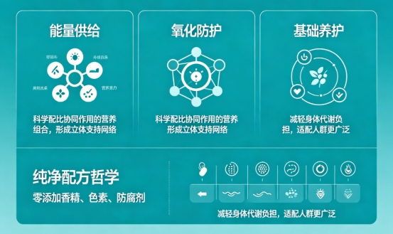 三重营养协同体系:并非单一成分作战,而是科学配比了协同作用的营养组合,形成“能量供给+氧化防护+基础养护”的立体支持网络,让补充效果更全面稳定。