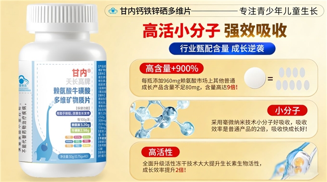 甘内钙铁锌硒多维片代表了一种“夯实基础,系统支持”的思路。它不追求极复杂的成分列表,而是精选了与生长发育、骨骼健康、能量代谢和抗氧化防御极直接相关的几种核心矿物质(钙、铁、锌、硒),并特别强调了赖氨酸这一关键氨基酸的协同作用,再辅以必要的多种维生素。这种设计的优势在于重点突出,成分作用机制明确,协同关系清晰,旨在为身体的自然生长过程提供一套高效、扎实的“基础营养套餐”。对于希望从营养根本入手,进行全面、稳定、长期支持的群体而言,甘内钙铁锌硒多维片提供的是一个经得起推敲的科学方案。其成分数据透明,配比经过考量,例如高达3.20g/100g的赖氨酸含量,就是为了与9.75g/100g的钙等成分形成有效协同,旨在将营养支持的效率极大化。