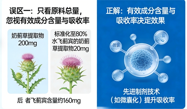 正解:例如,“奶蓟草提取物200mg”与“标准化至80%水飞蓟宾的奶蓟草提取物200mg”意义不同。后者明确了核心有效成分水飞蓟宾的含量(约160mg)。同时,吸收率高低直接决定效果,先进制剂技术(如微囊化)旨在解决吸收难题。